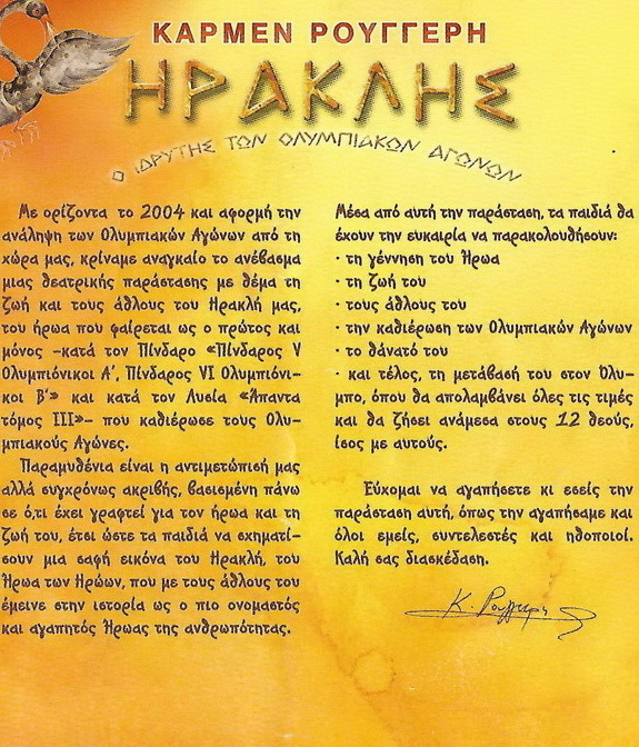 Η Κάρμεν Ρουγγέρη και οι συνεργάτες μας, ετοίμασαν μια παράσταση με παραμυθένια αντιμετώπιση αλλά συγχρόνως ακριβής στα ιστορικά στοιχεία. Μια παράσταση με 12 ηθοποιούς, πλούσια σκηνικά και καταπληκτικά κοστούμια, βασισμένη πάνω σε ότι έχει γραφτεί για τον ήρωα και τη ζωή του έτσι ώστε τα παιδιά να σχηματίσουν μια σαφή εικόνα του Ηρακλή, του ήρωα των ηρώων, που με τους άθλους του έμεινε στην ιστορία ως ο πιο ονομαστός και αγαπητός ήρωας της ανθρωπότητας.